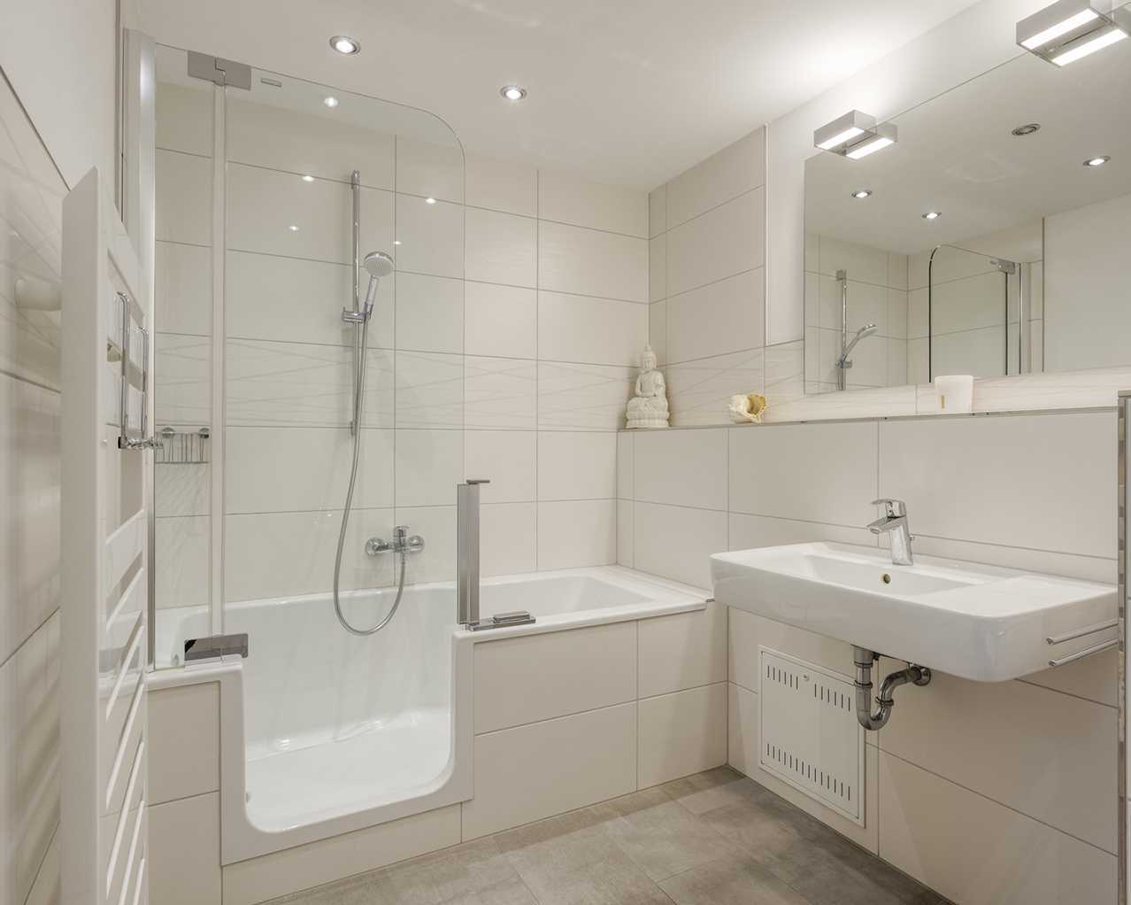 Das geräumige Badezimmer wurde 2020 saniert, ist mit weißen Wand- und grauen Bodenfliesen ausgestattet und verfügt über eine Badewanne mit niedrigem Eintritt.