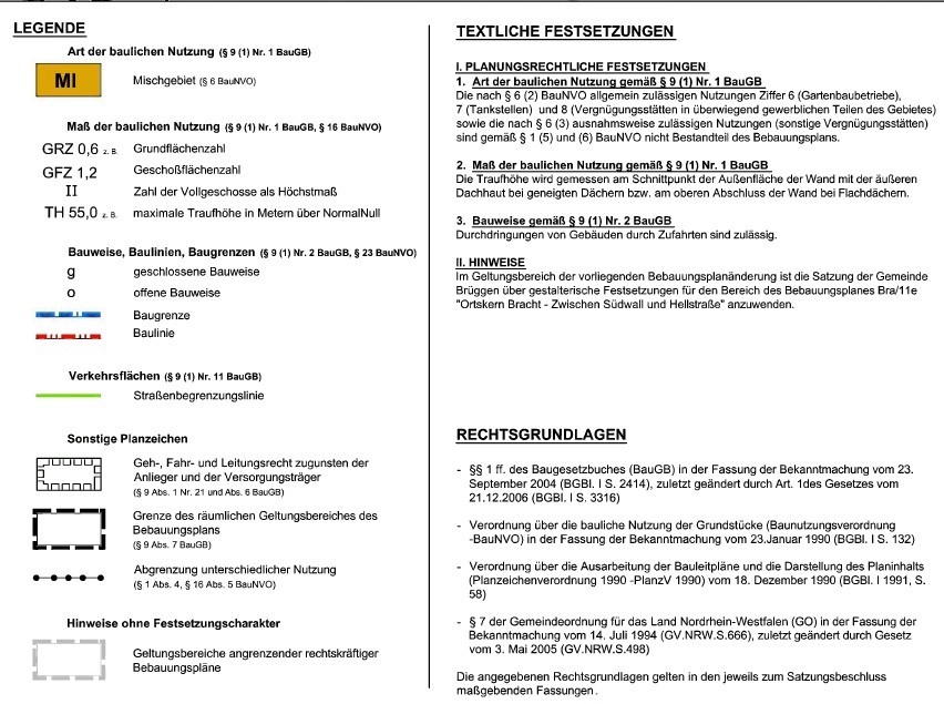 • Das Grundstück liegt im Geltungsbereich des Bebauungsplans Bra/11e „Ortskern Bracht – zwischen Südwall und Hellstraße“. Dieser weist aus: MI (Mischgebiet), offene Bauweise, 2 Vollgeschosse (II); TH 55,0; GRZ 0,6; GFZ 1,2. (Sie können den Bebauungsplan unter folgendem Link einsehen: https://xplanservices.krzn.de/viersen/xplan-wms/getAttachment?featureID=XPLAN_BP_PLAN_1bcc81b0-7643-46b4-8831-bd999108e806 und filename=BA_011E_0_Bebauungsplan.pdf)