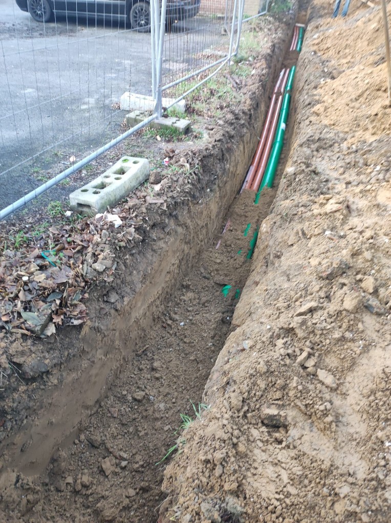 • Das Grundstück besteht momentan noch aus 5 Parzellen (Flur 24, Nr. 183, 681, 969, 994 und 995), die miteinander vereinigt werden sollen. Weiterhin gehören jeweils ½-Anteile der Wegeflächen (Flur 24, Nr. 970, 971) zu den Grundstücken. Drei Leerrohre für Versorgungsleitungen und ein Abwasserkanal (grün) sind bereits verlegt (siehe Fotos). Es besteht die Verpflichtung die gemeinsame Wegefläche später zum Gehen und Fahren herzurichten. Die Kosten der Herstellung müssen zu ½ Anteil übernommen werden.