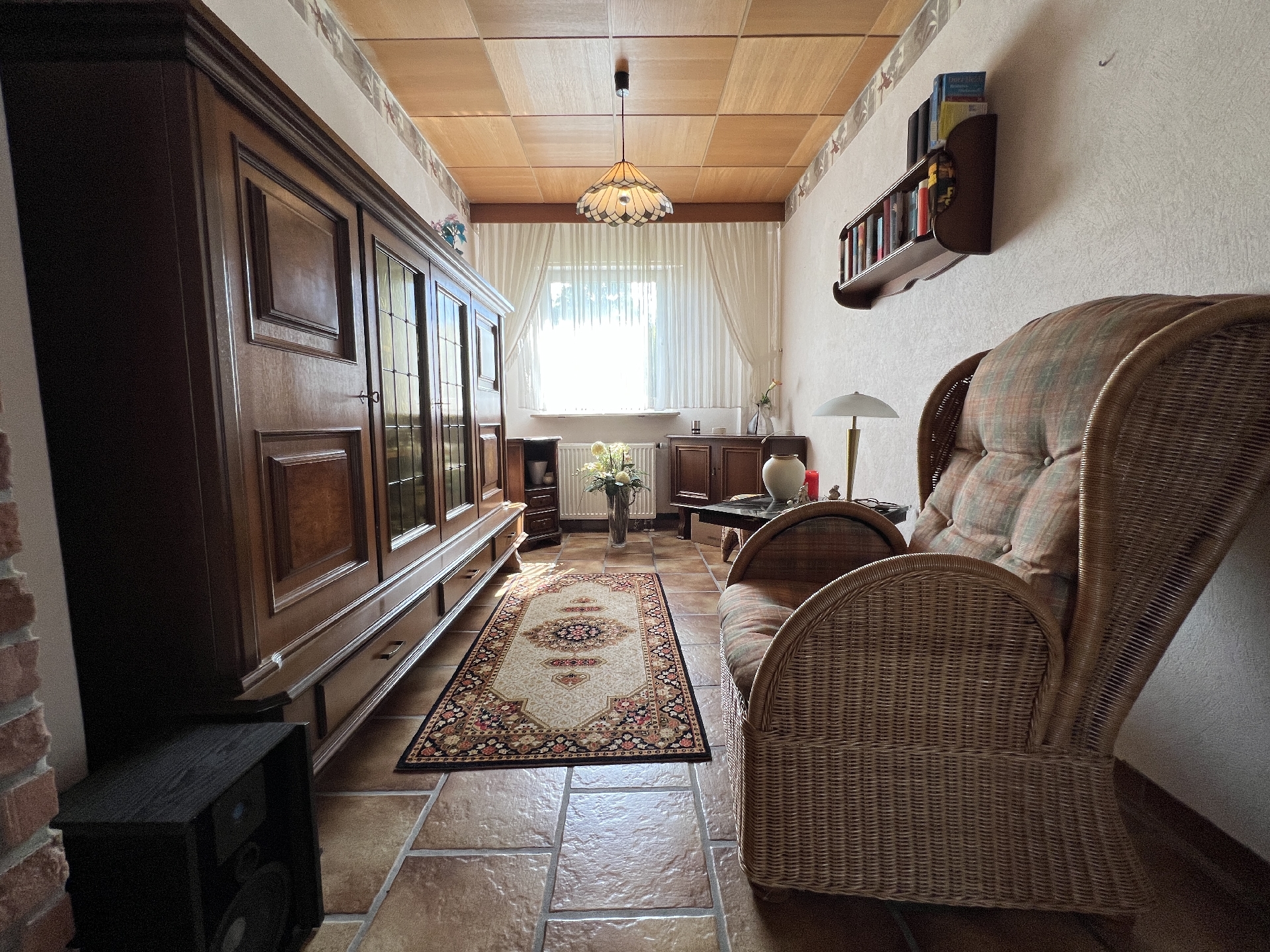 Eine moderne, überdachte Eingangstür gewährt Ihnen Zutritt in den zentralen Hausflur mit Treppe, die links in die Obergeschoss-Ebene führt. Die Erdgeschoss-Einheit betreten Sie über einen kleinen Flur mit Garderobe. Geradeaus erreichen Sie den offenen, geräumigen Wohn-/Essbereich, der Ihnen über eine Terrassentür Zugang in den Garten bietet, der nach Nord-West ausgerichtet ist. Im schön angelegten, großen Garten finden Sie ein großes Gartenhaus und eine komplette Einfriedung. Er ist nicht nur ein Paradies für kreative Gartenliebhaber. Eine große Rasenfläche lädt Sie und Ihre Kinder in der Freizeit zum Spielen ein. Der Terrassentritt sowie die rechtsseitig liegende Außentreppe in den Keller sind gefliest. Eine Kunststoffüberdachung erstreckt sich über die gesamte, gepflasterte Terrasse nebst Treppe. Hier finden Sie bei jedem Wetter Schutz, wie z. B. bei starker Sonnenbestrahlung oder bei Regenwetter. Vom Essbereich des Erdgeschosses gelangen Sie linksseitig weiter über einen offenen Bogen in die Küche und von dort aus zum natürlich belüfteten Duschbad sowie zum Gäste-WC und ins Schlafzimmer.