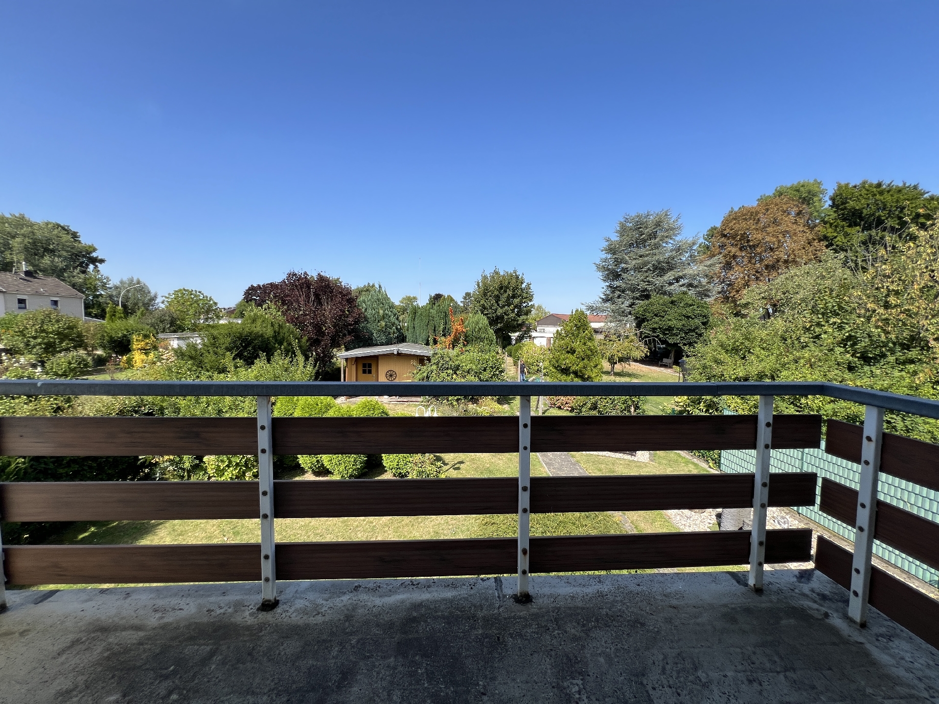 Linksseitig vom Objekt liegt die zum Haus gehörende, 1980 errichtete Fertiggarage mit Stromzufuhr und gepflasterter Einfahrt. Der Abstand zwischen der freiliegenden Hausseite wurde mit einem kleinen, zugänglichen Metallzaun überbrückt, der den gepflasterten Gehweg zur Straße mit dem Garten verbindet. Den Abschluss der Gartens bildet eine Rundbogenhecke mit abschließbarem Metallzaun. Vor dem Haus liegt ein kleiner Vorgarten. Hinter dem Haus finden Sie einen großen Garten mit Rasen- und Pflanzbereichen. Zu dem auf halber Höhe befindlichen Gartenhaus führt ein gepflasterter Gehweg.