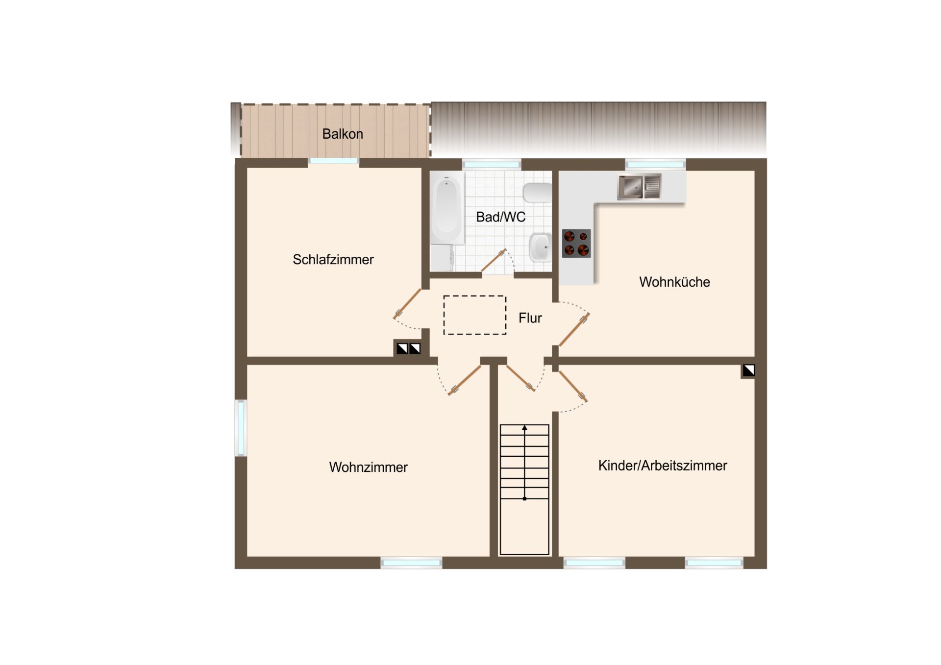 Eine geschlossene Holztreppe führt Sie ins Obergeschoss. Bevor Sie über eine Türe in die schmale Diele der Etage eintreten, liegt rechtsseitig das Kinder-/Arbeitszimmer. Vom innenliegenden Flur aus sind alle anderen Räume der Etage erreichbar. Zur Gartenseite hin befinden sich ein Schlafzimmer mit Zugang zum kleinen Balkon, der linksseitig mit einem Sichtschutz versehen ist. Zum anderen liegt hier ein Raum, der früher als Küche genutzt wurde. Zwischen beiden Zimmern liegt das natürlich belüftete Badezimmer mit Wanne und Spritzschutz zum Duschen in der Badewanne. Die Beheizung des Obergeschosses erfolgt über die oberhalb der Wanne befindliche Gastherme. Das zur Straßenseite liegende, helle Wohnzimmer sowie das Kinder-/Arbeitszimmer komplettieren diese Etage.