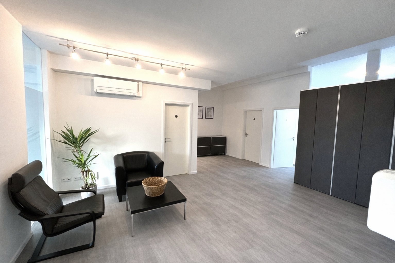 Großflächige Fenster, weiß gestrichene Wände, gepflegter, ggf. in Abstimmung mit dem Eigentümer, neuer Bodenbelag (grauer Boden = KI-generiert, Schachbrettmuster aktuell). Fernwärme sorgt für Nahwärme – und eine Klimaanlage für den kühlen Kopf. Dazu eine Teeküche (ohne Spülmaschine). Eigentlich ist schon alles bereitet!