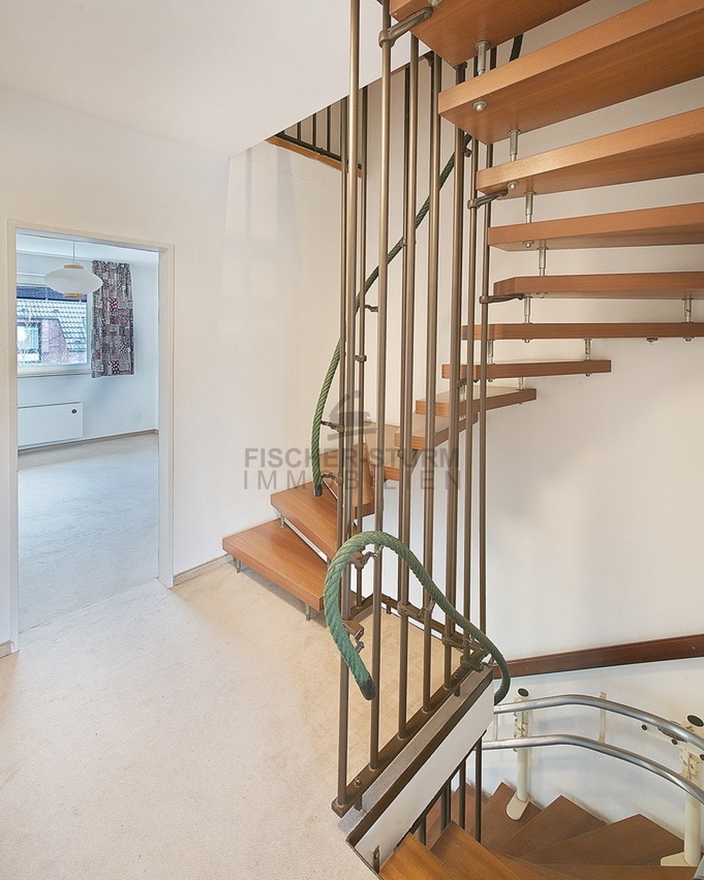 Eine offen gestaltete, gewendelte Treppe führt ins Obergeschoss. Hier gibt es drei Schlafzimmer sowie ein Duschbad mit Fenster.