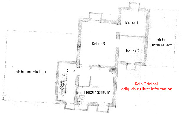 Keller: Im Keller befinden sich neben der Diele drei Kellerräume, die als Abstell- bzw. Vorratsräume genutzt werden können. Des Weiteren ist ein Heizungsraum vorhanden. Eine Garage ist ebenfalls unterkellert. Seitlich der Garage führt eine Außentreppe direkt in den Keller.