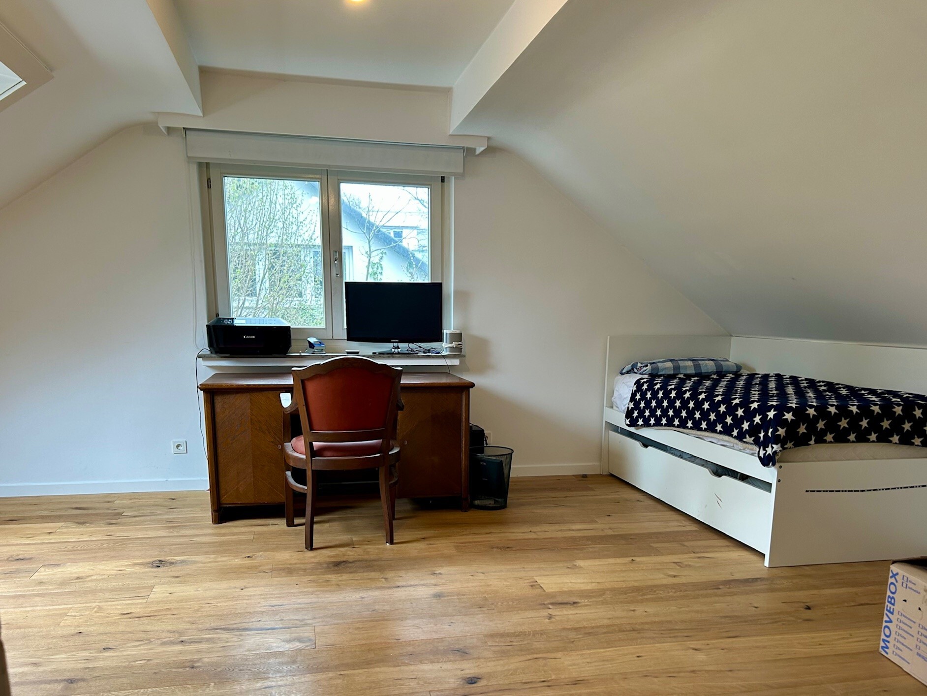 Dieses freistehende Einfamilienhaus auf einem beeindruckenden Grundstück von etwa 1300 m² bietet ideale Wohnbedingungen für Familien mit 2 bis 4 Personen. Die großzügigen Räume, insbesondere der Wohn-/Essbereich mit Kamin und Panoramafenster, schaffen ein einladendes Ambiente und bieten einen herrlichen Blick auf das gepflegte Parkgrundstück. Im Obergeschoss befinden sich zwei große Zimmer mit einem Duschbad, die vielfältige Gestaltungsmöglichkeiten eröffnen.