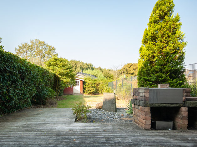 Die Garage vor dem Haus ist eher für Fahrräder oder ein kleines Auto geeignet. Der Garten ist auch über einen rückwärtigen Weg erreichbar.