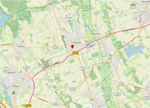 • An einer Ortsausgangsstraße in zentrumsnaher und verkehrsgünstiger Wohnlage von 47929 Grefrath. Die Läden des täglichen Bedarfs sowie Ärzte und Apotheken etc. erreichen Sie fußläufig. Grefrath verfügt über verschiedene Freizeit- und Erholungsmöglichkeiten, so z.B. über ein Eisstadion oder Freibad. Durch die nahe gelegenen Autobahnen A61 Richtung Venlo (NL) bzw. Mönchengladbach/Düsseldorf/Köln und A40 Richtung Venlo (NL) bzw. Ruhrgebiet haben Sie optimale Verkehrsanbindungen. Die B509 führt Sie direkt in den Krefelder Raum. Nicht unerwähnt bleiben sollten die internationalen Zugverbindungen ab Bahnhof Kempen.