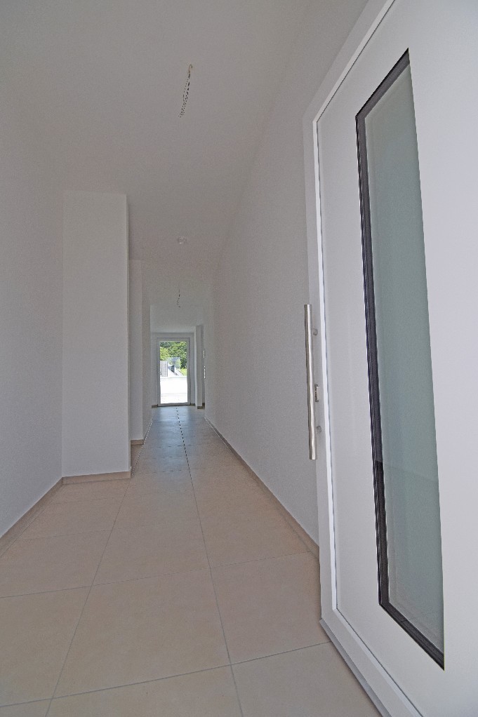 Über den vorhandenen Aufzug oder das Treppenhaus gelangt man zur entsprechenden Etage und von da aus, über einen Laubengang, zur Wohnungseingangstür. Diese ist in Kunststoffausführung, weiß, mit einem Glaseinsatz.