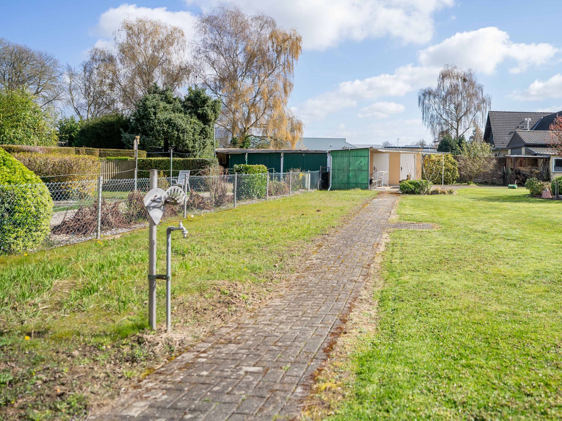 Der große Garten ist pflegeleicht angelegt und über die großzügige Einfahrt auch mit dem Auto erreichbar. Hier befinden sich die große Doppelgarage mit zusätzlichem Stauraum unter dem Dach sowie einige ältere Wirtschaftsgebäude. Zum Nachbargrundstück rechts ist das Grundstück derzeit nicht über einen Zaun abgetrennt. Eine Abtrennung kann aber auf Wunsch in Absprache mit dem Nachbarn erfolgen.