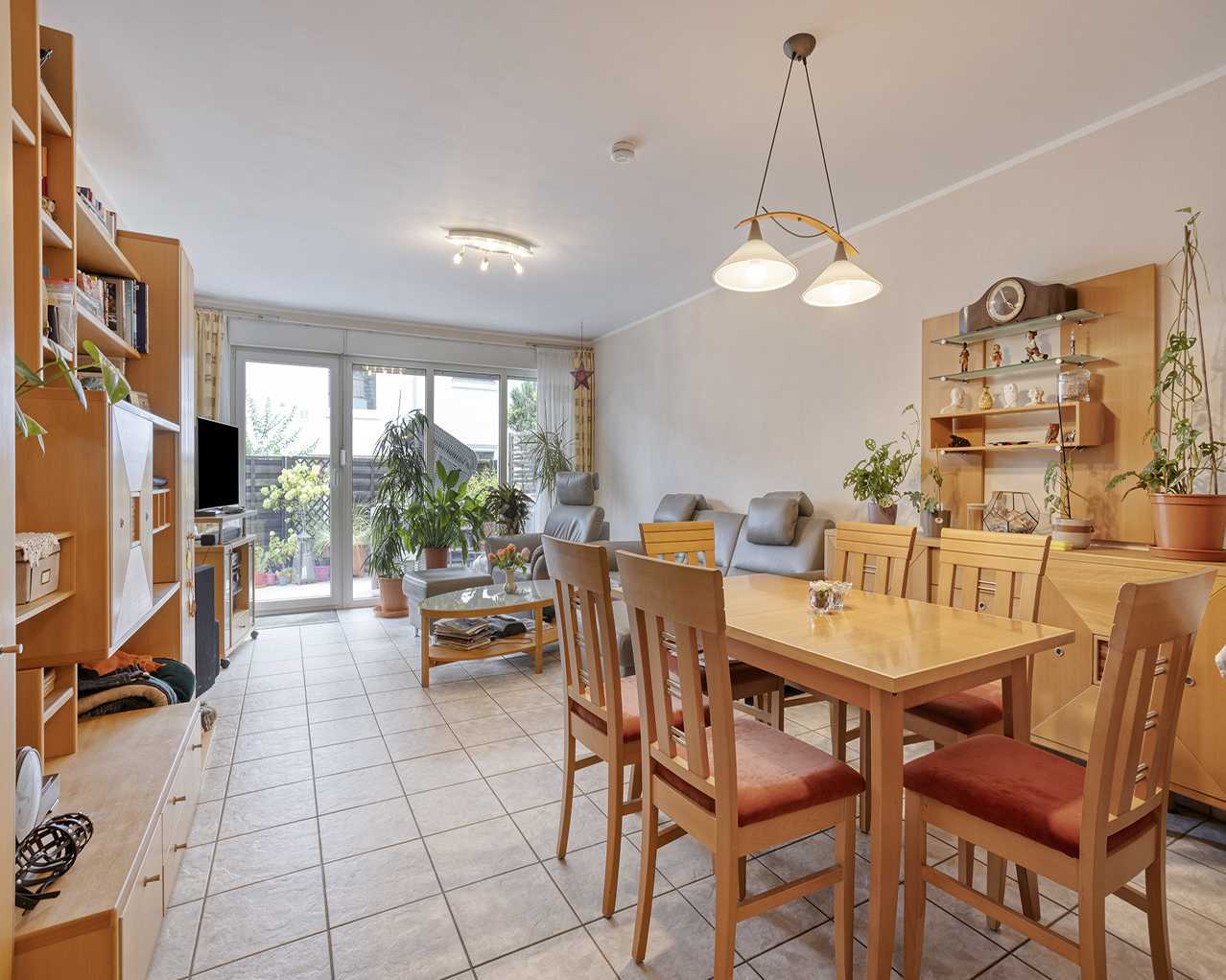 Der Lebensmittelpunkt der Wohnung ist der lichtdurchflutete Wohn- und Essbereich mit direktem Zugang zur Terrasse. Hier lassen sich gemütliche Stunden mit Familie und Freunden verbringen.