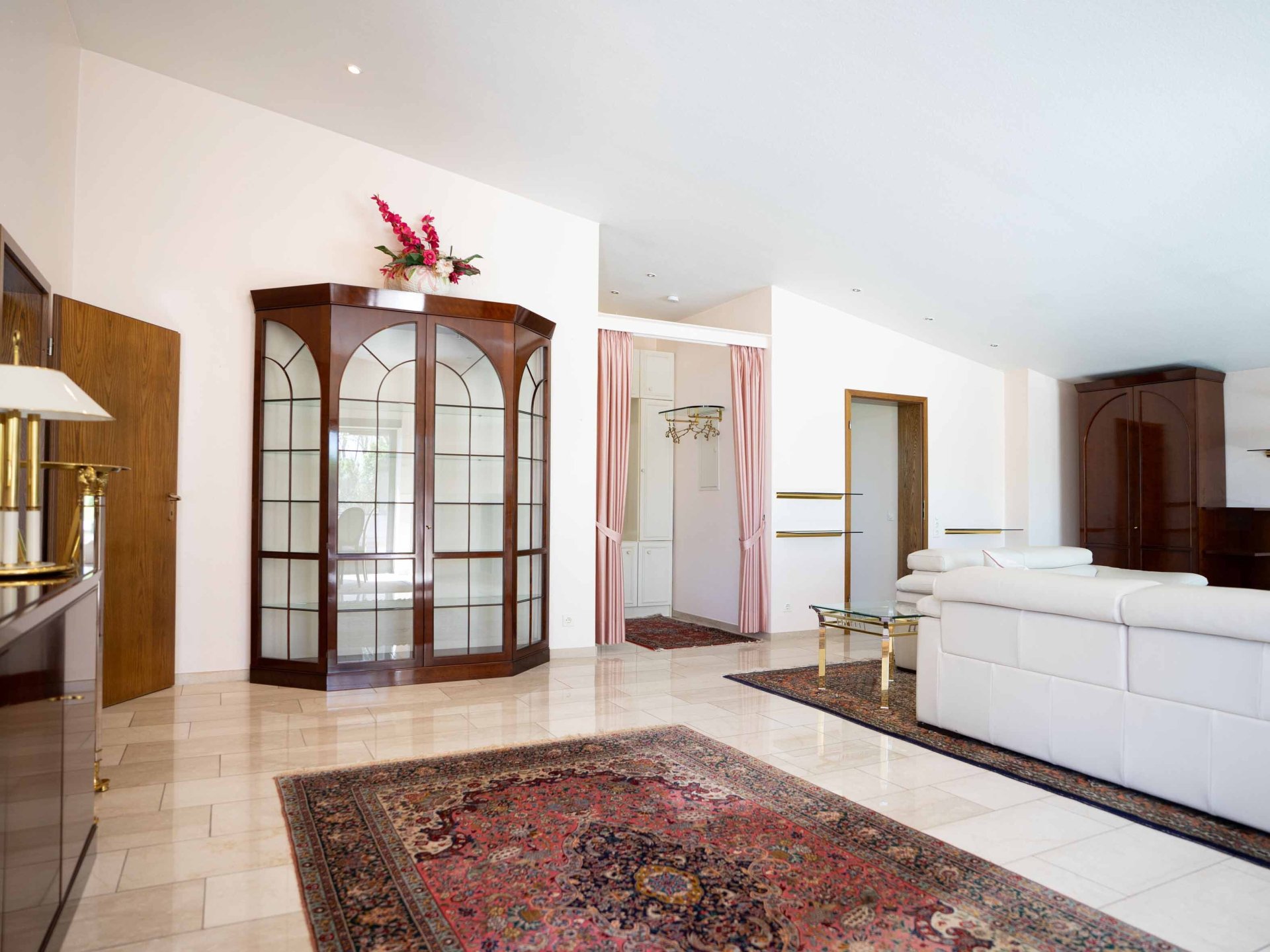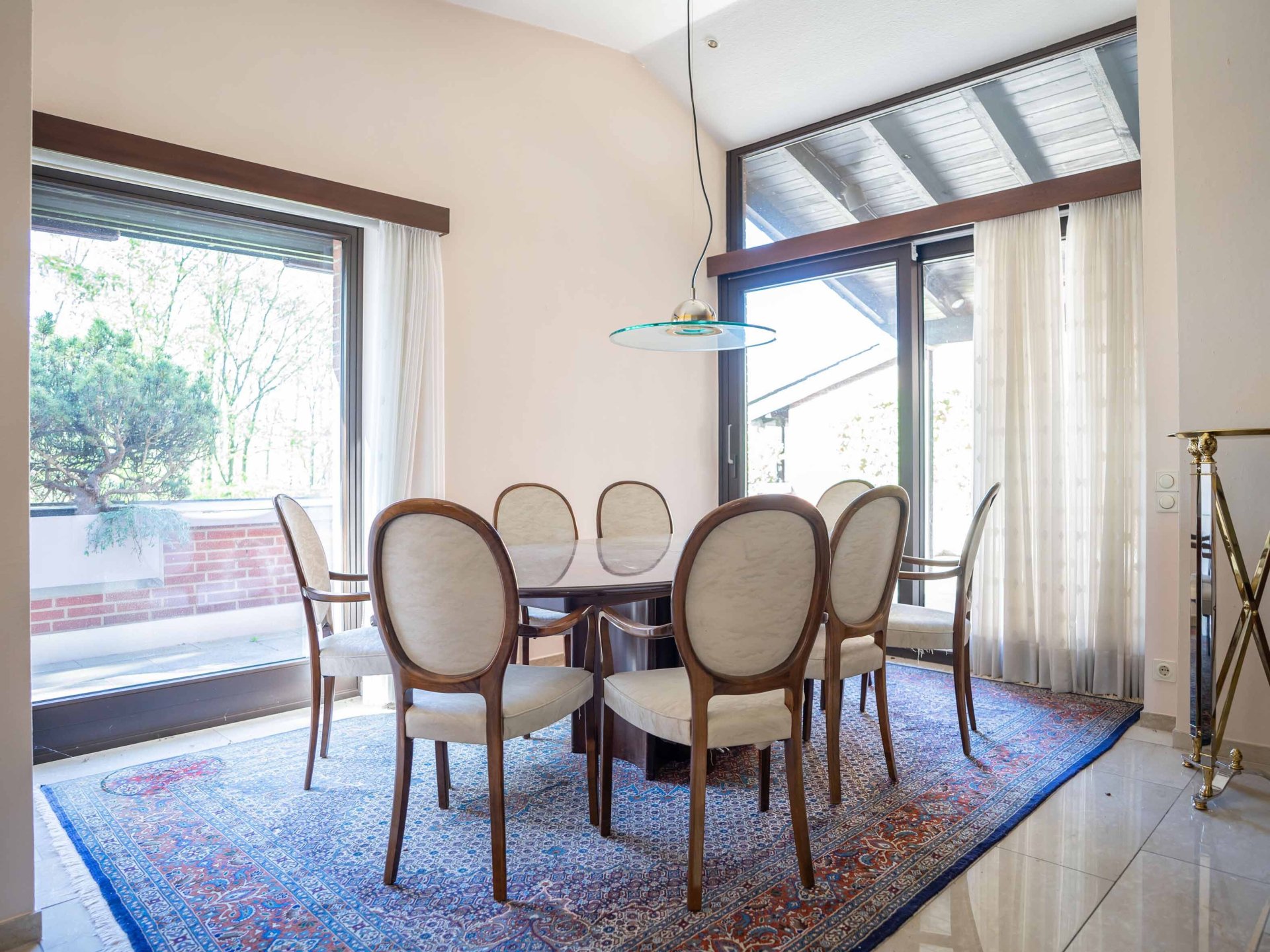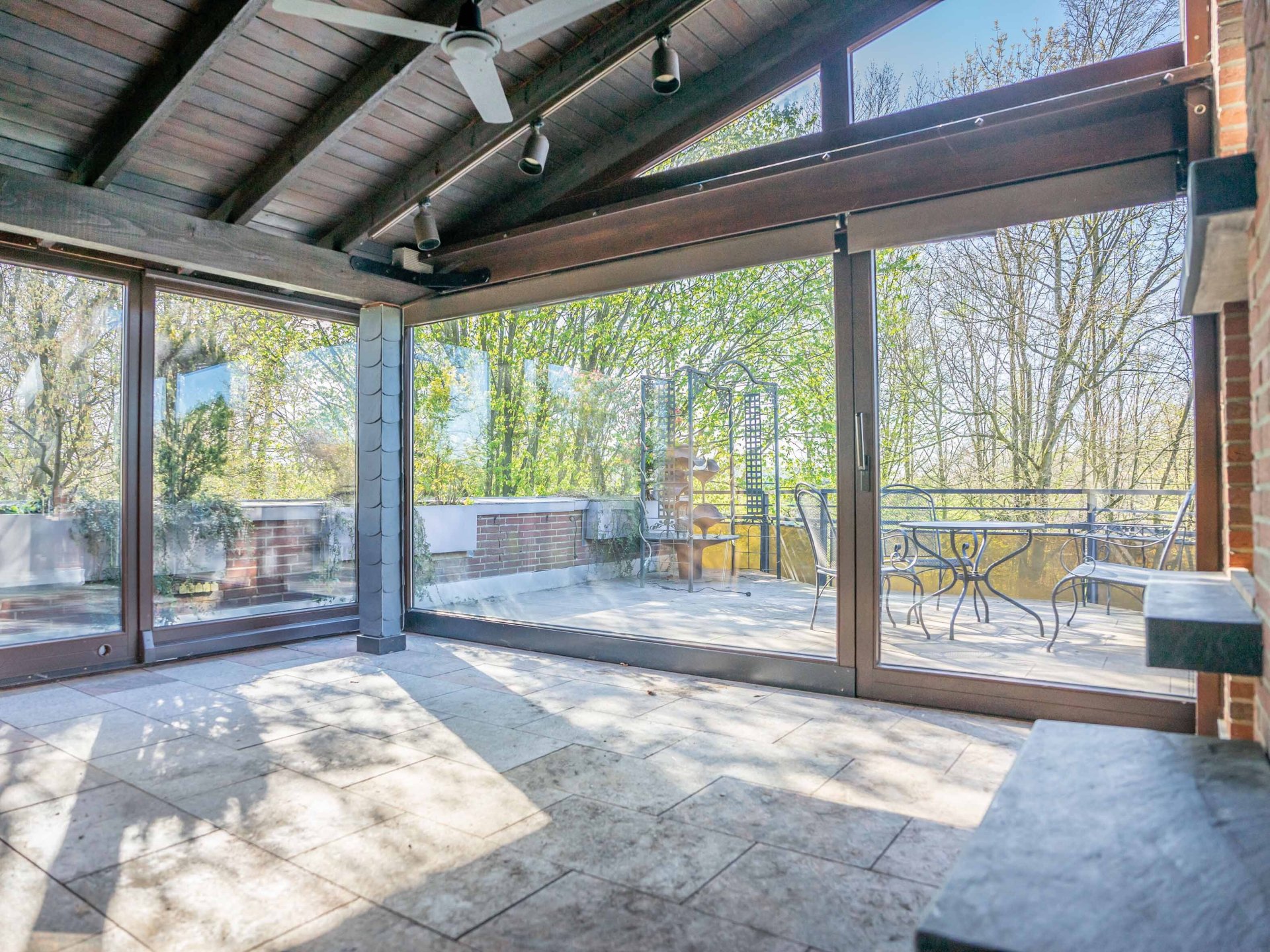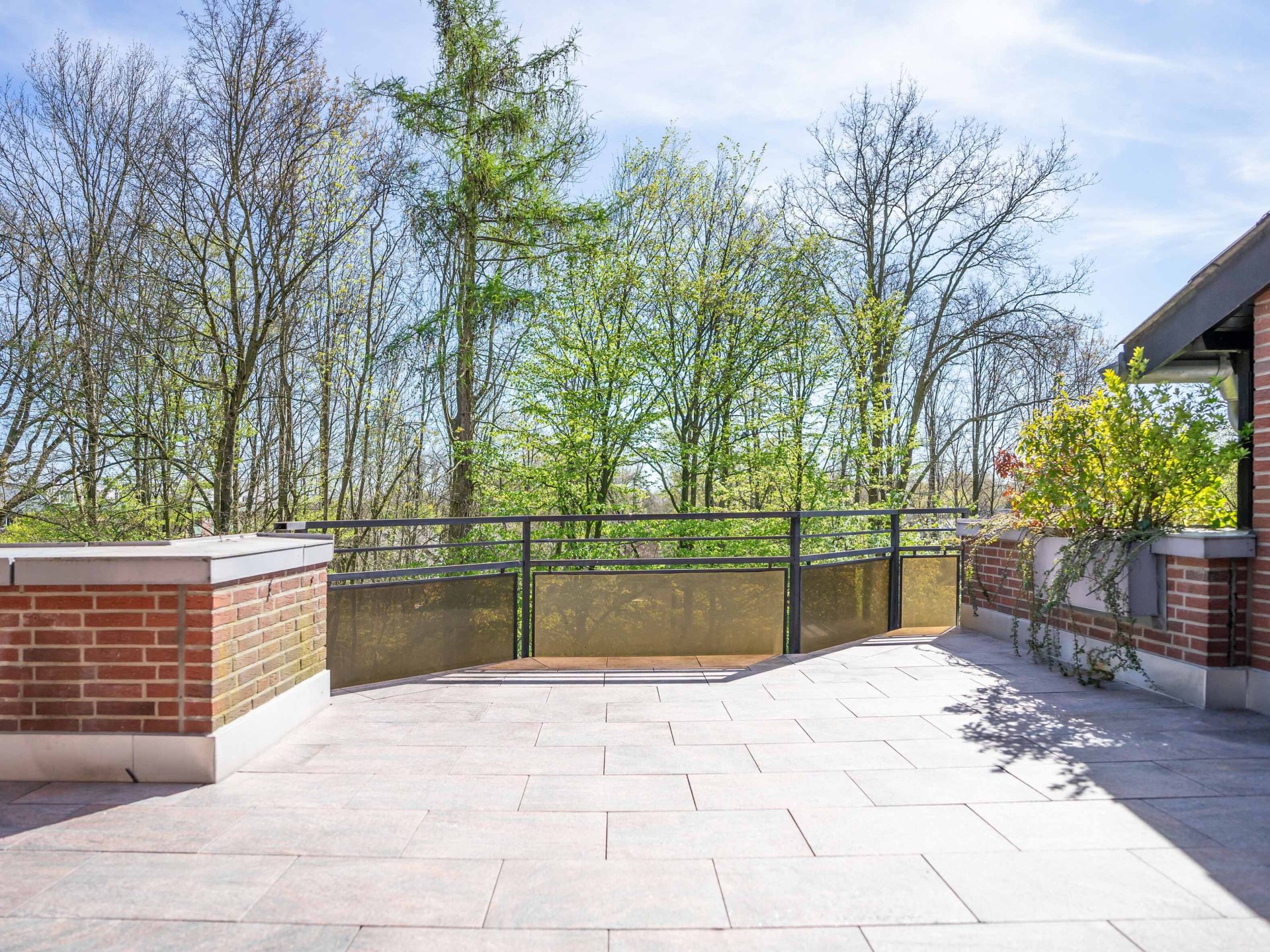Das Highlight ist die über 60 m² große Dachterrasse, die sowohl über den Wintergarten mit Kamin als auch direkt von der Küche aus zugänglich ist. Sie ist nach Süden ausgerichtet und von Bäumen eingerahmt, was eine angenehme Atmosphäre schafft. Ein großer Abstellraum mit Anschlüssen für Waschmaschine und Trockner befindet sich im hinteren Bereich der Terrasse.