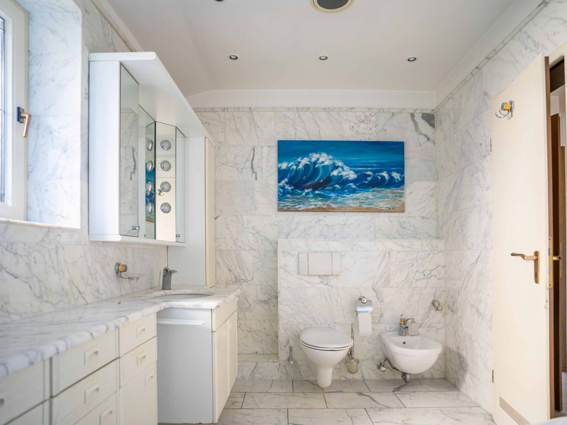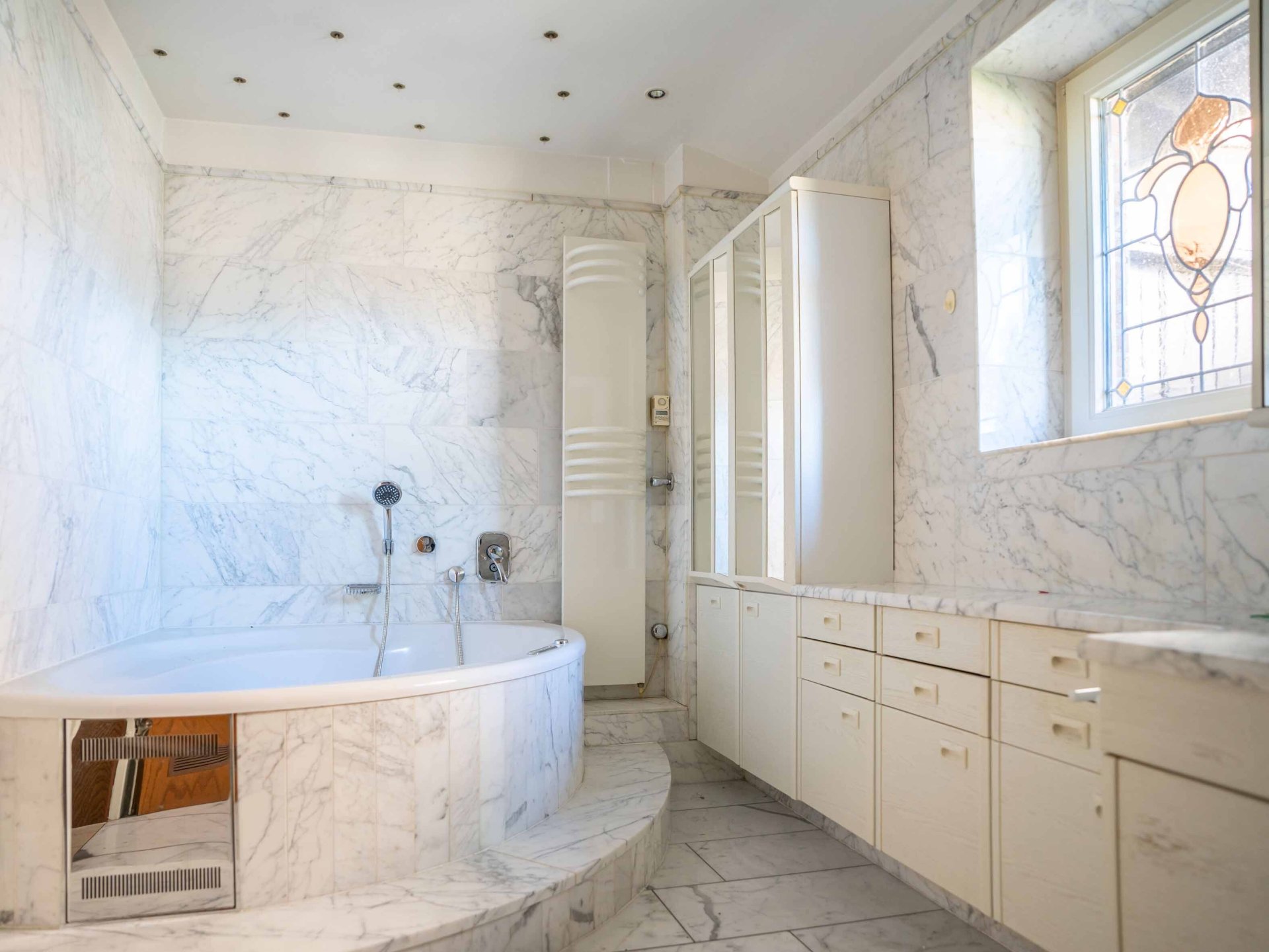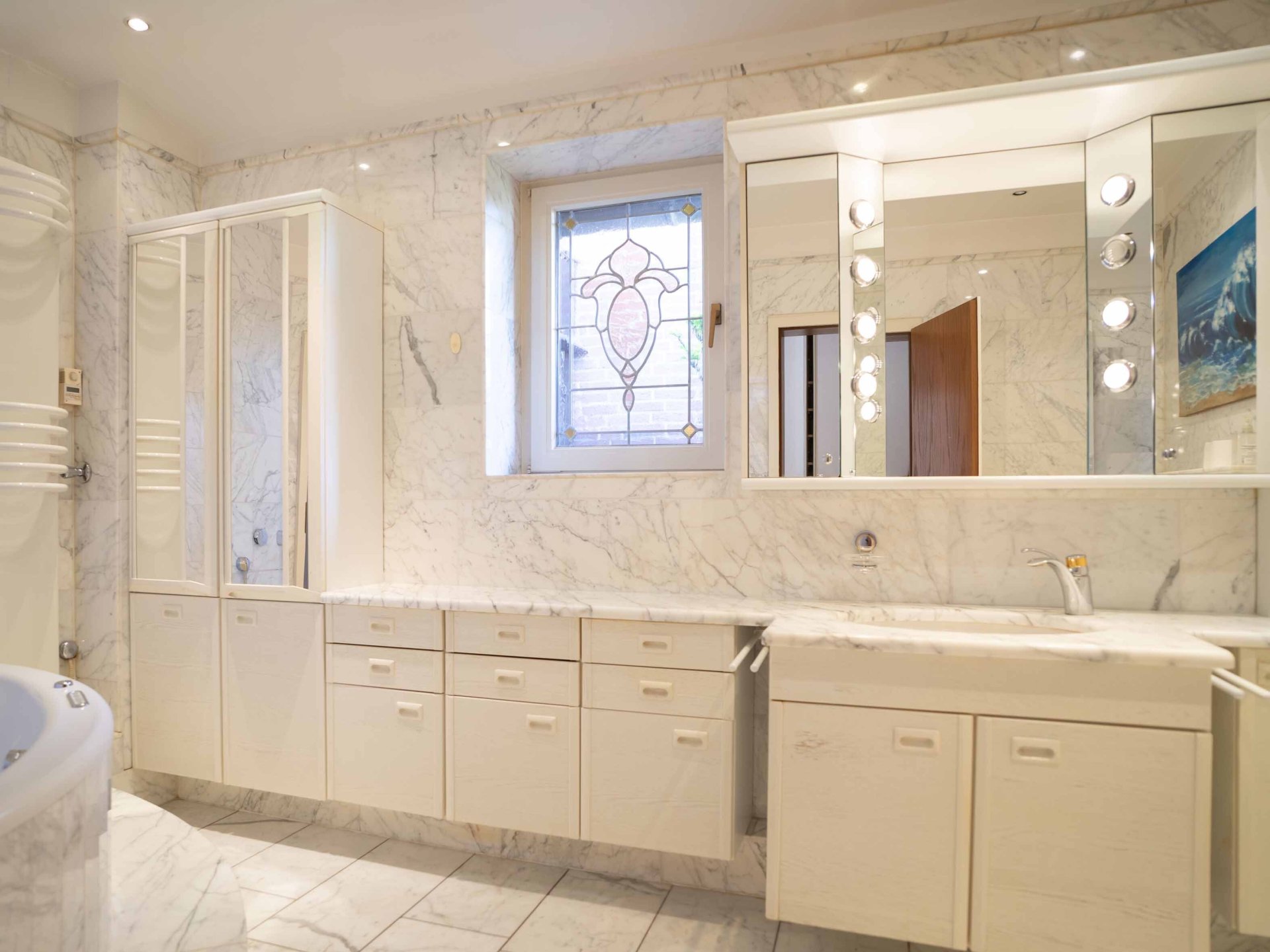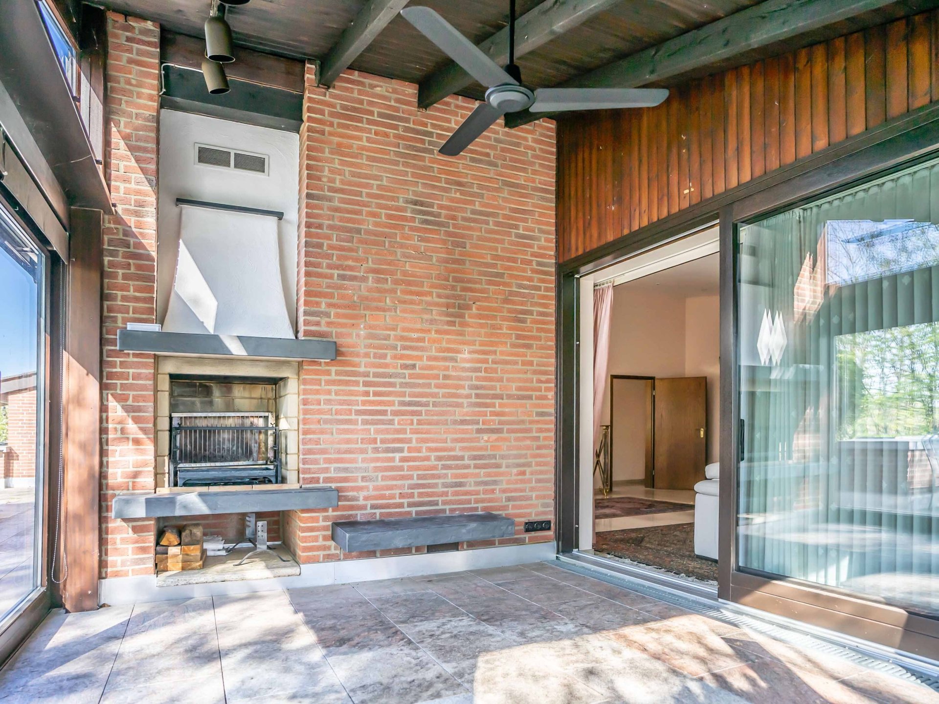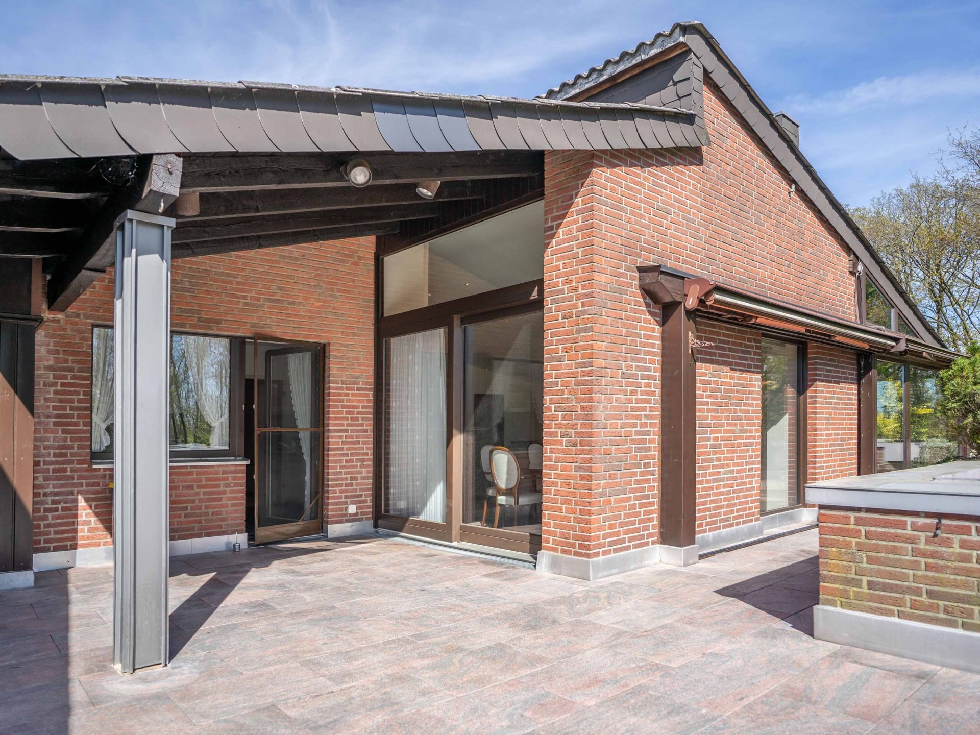 Das Highlight ist die über 60 m² große Dachterrasse, die sowohl über den Wintergarten mit Kamin als auch direkt von der Küche aus zugänglich ist. Sie ist nach Süden ausgerichtet und von Bäumen eingerahmt, was eine angenehme Atmosphäre schafft. Ein großer Abstellraum mit Anschlüssen für Waschmaschine und Trockner befindet sich im hinteren Bereich der Terrasse.