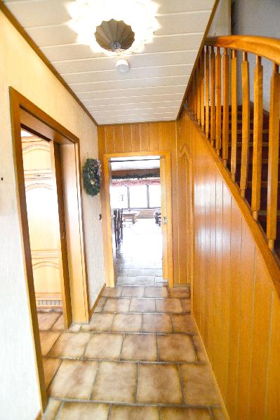 Im Erdgeschoss befinden sich die Diele, von der man in die Küche und das Wohnzimmer mit Essbereich sowie den Anbau gelangt. Vom Wohnzimmer hat man einen schönen Blick in den Garten. Der Wohnraum ist durchgehend mit Fliesen ausgelegt. Vom Garten aus besteht die Möglichkeit in die Garage zu gelangen.