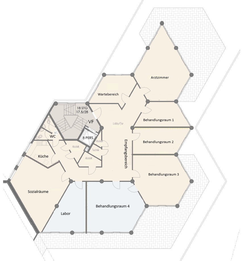 Die klimatisierte Fläche ist per Aufzug und ebenerdig über die Tiefgarage zu erreichen. Sie überzeugt durch ihren besonderen Charme und eine begehbare Dachaußenfläche mit Dachteich. Die Räumlichkeiten sind freundlich gestaltet und bieten vielfältige Nutzungsmöglichkeiten (Beauty, Heilberufe etc.). Die Anzahl der Räume und die Aufteilung sind flexibel. Die Fläche wird nach den Wünschen und Anforderungen des Mietinteressenten hergerichtet und schlüsselfertig übergeben.